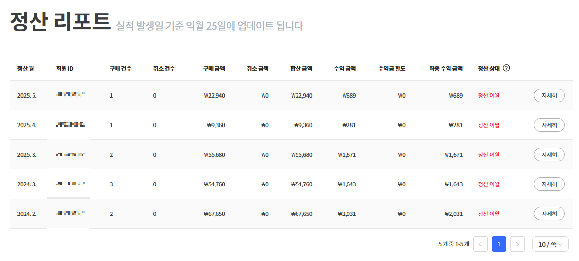 3) 수익 지급은 1개월 단위를 원칙으로 하며, 취소 및 반품된 금액은 수입에서 모두 제외됩니다. “실적 리포트에서는 수익이 있어 보였는데 정산 리포트에서 줄어든 경우”는 취소/반품 반영 타이밍 차이 때문일 가능성이 큽니다.