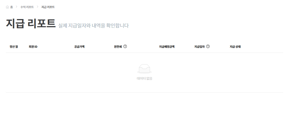 - 지급 조건을 충족하여 실제로 지급 가능한 정산금이 있는 경우 확인되는 리포트입니다. “다음 지급일에 얼마 받을지” 궁금하다면 실적 확정일(25일) 이후 지급 리포트를 확인하라고 안내합니다.