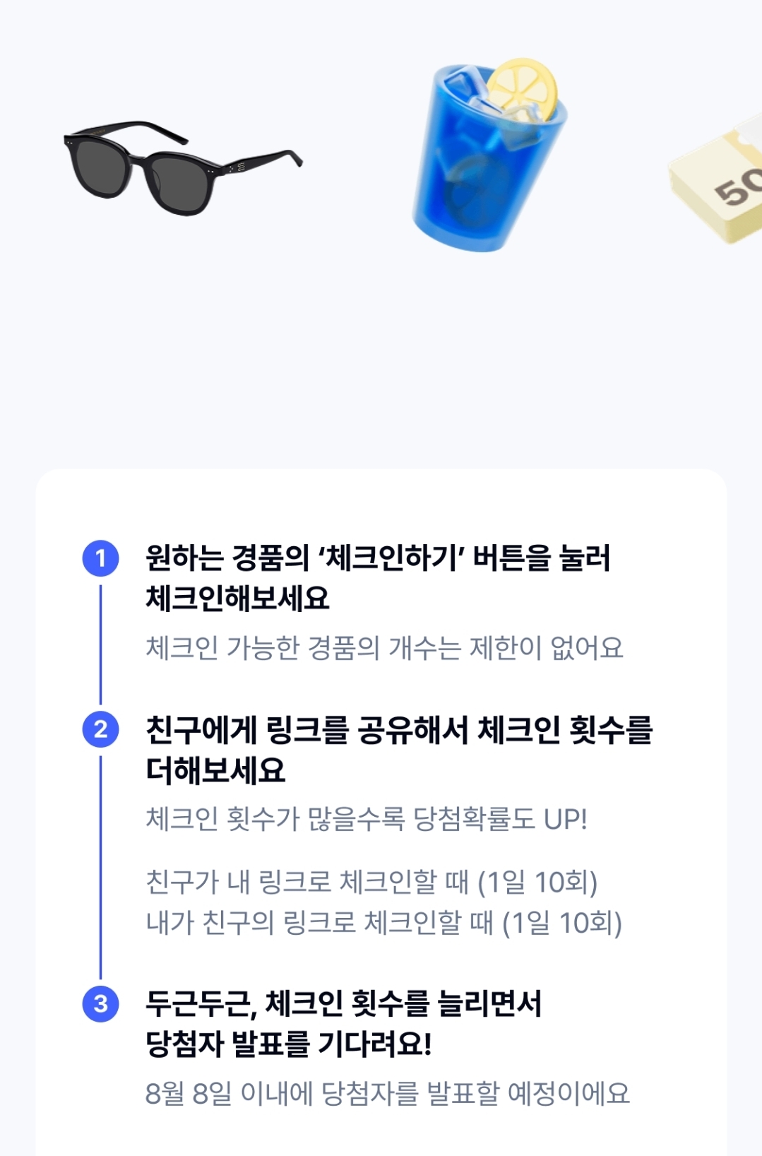 - 체크인 가능한 경품의 개수에는 제한이 없습니다.