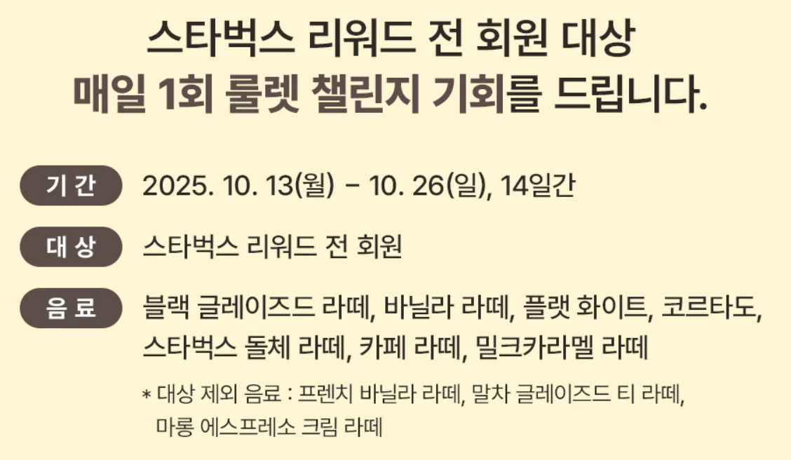스타벅스 라떼 페스타 기간 2025년 10월 13일 (월) ~ 10월 26일(일) 총 14일간
