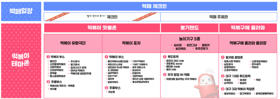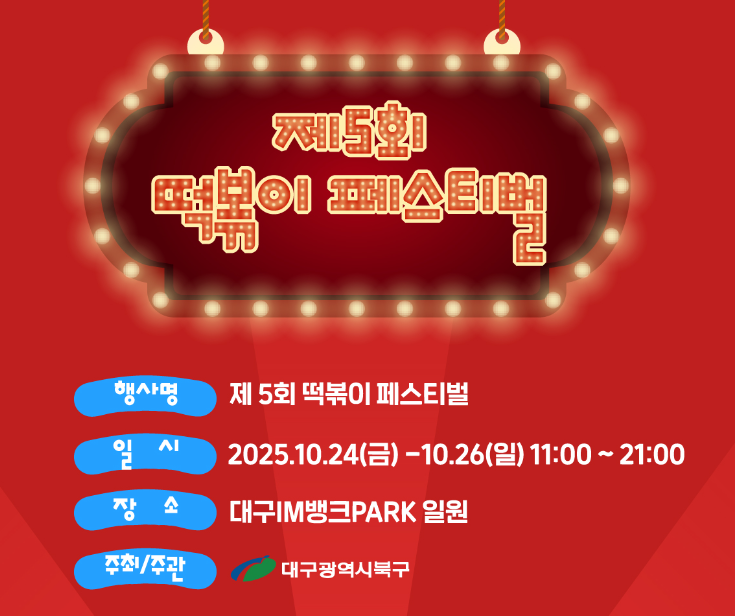- 주요 내용: 전국의 유명 떡볶이 브랜드가 참여하는 ‘떡볶이 맛볼 존’, 랜덤 떡볶이 맞추기, 외국인 대상 떡볶이 콘테스트, 보이는 라디오와 레트로 가요제, 롤러장 재현 ‘떡볶구에 롤러와’, 어린이 놀이공간 ‘뽀기랜드’ 등으로 구성된 대표 K-푸드 축제.