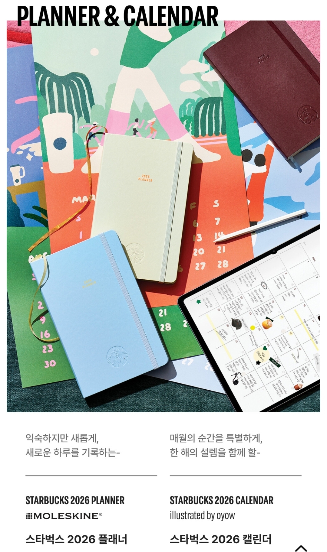대표 상품은 스타벅스 전통 아이템인 플래너 3종(라이트 그린·스카이 블루·버건디)이며, 종이 다이어리 외에도 굿노트용 ‘2026 디지털 플래너’가 제공돼 디지털 환경에서도 사용 가능합니다.