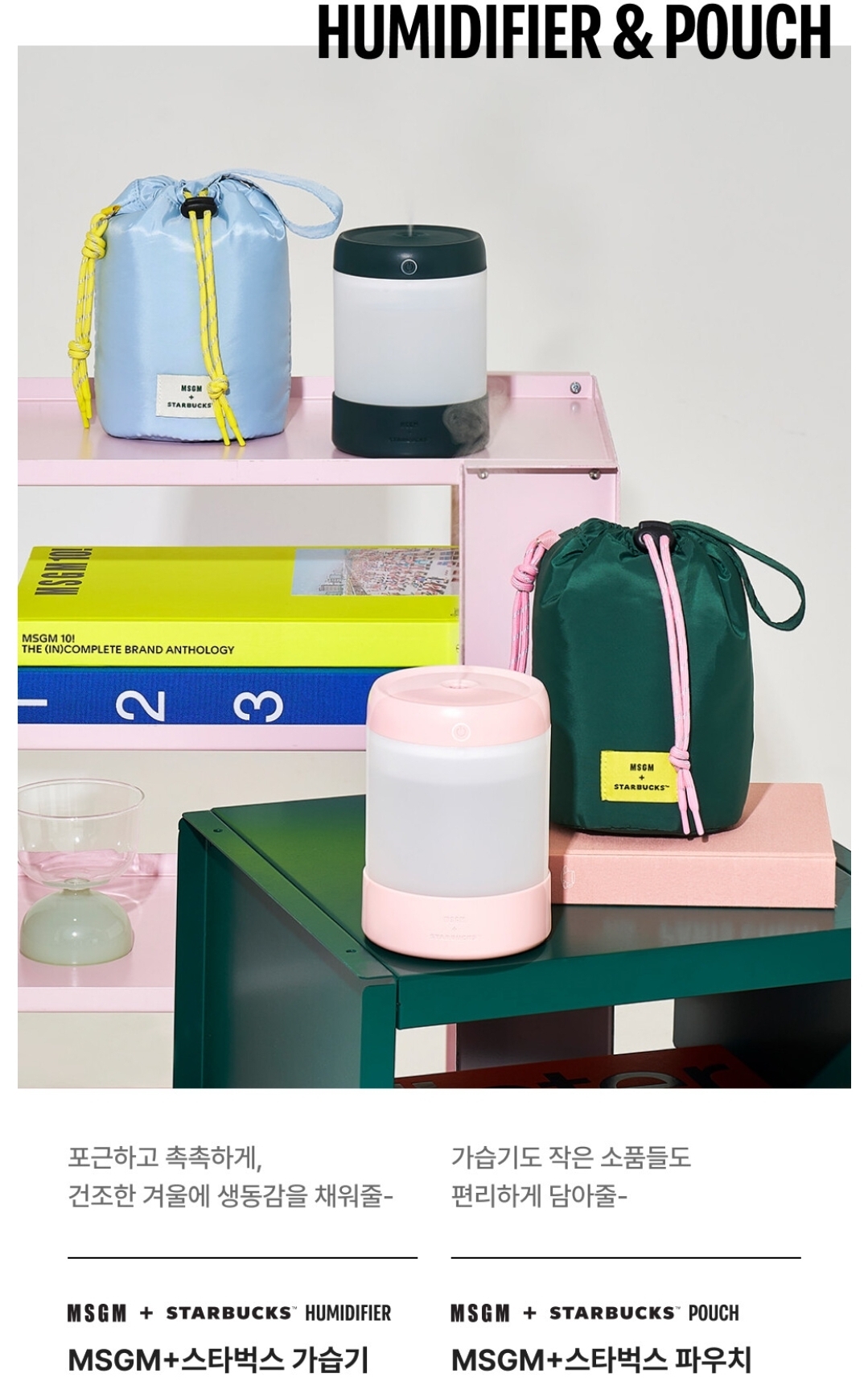 추가로 MSGM+스타벅스 블루그린·스카이 블루), 가습기(그린·핑크), 양말 2종, 파우치 2종 등이 포함되며 전체적으로 컬러톤이 파스텔 계열로 맞춰져 있습니다.